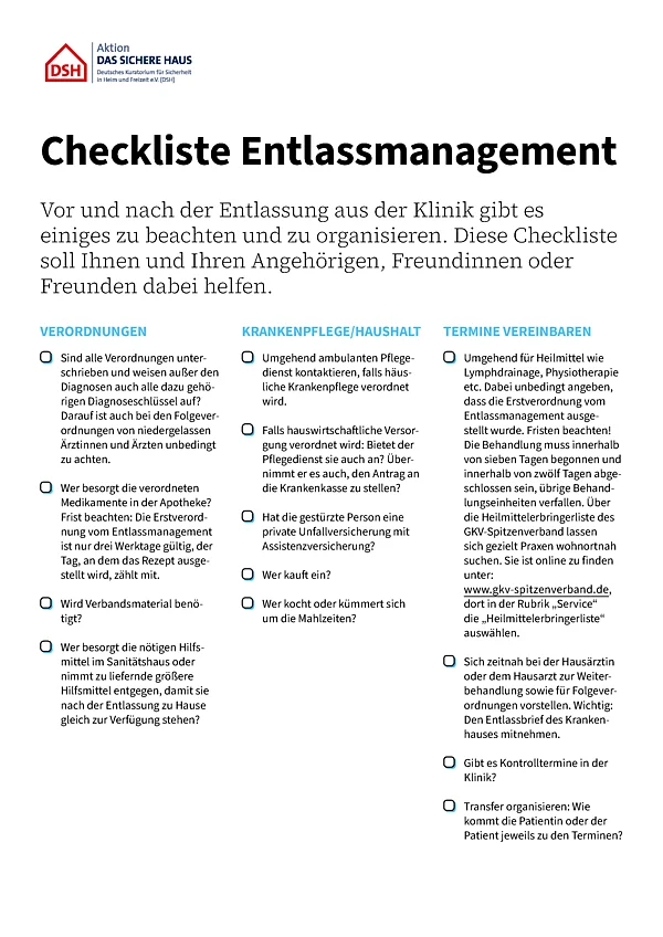 Nach einem Klinikaufenthalt dauert es häufig noch einige Zeit bis zur vollständigen Genesung, meistens zu Hause. Krankenhäuser und Reha-Kliniken sind verpflichtet zu klären, welche Unterstützung eine Patientin oder ein Patient anschließend noch benötigt, um die Entlassung demgemäß zu planen. Auf dieses so genannte Entlassmanagement haben gesetzlich Versicherte einen Anspruch, ihre Teilnahme ist freiwillig, und sie müssen schriftlich zustimmen.